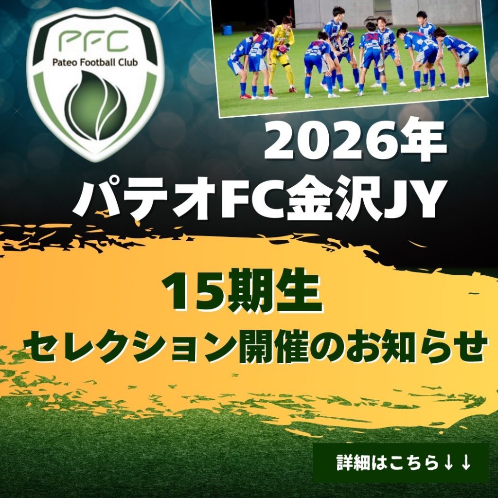 この度、2026年度中学1年生になる現小学6年生を対象とした「パテオFC金沢ジュニアユース15期生セレクション」を下記の通り実施することとなりましたのでお知らせいたします。