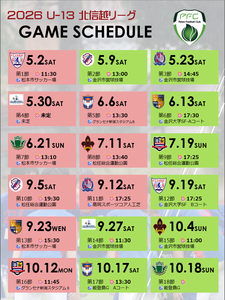 高円宮杯JFA U-13サッカーリーグ2026 第13回北信越リーグ日程決定